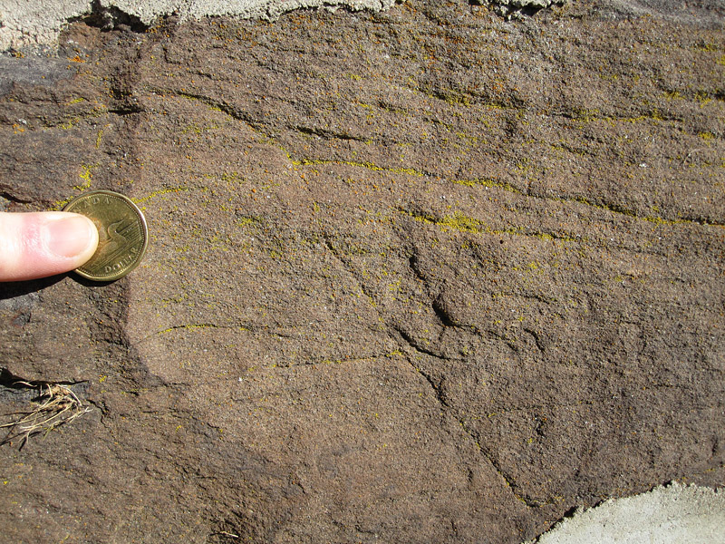 This cross-stratified sandstone also apparently shows small-scale faulting (coin diameter is 26.5 mm).