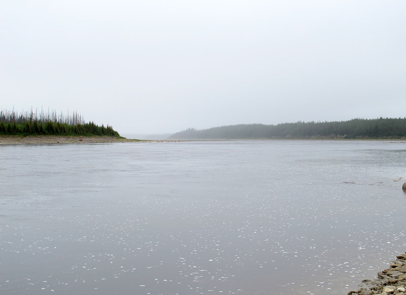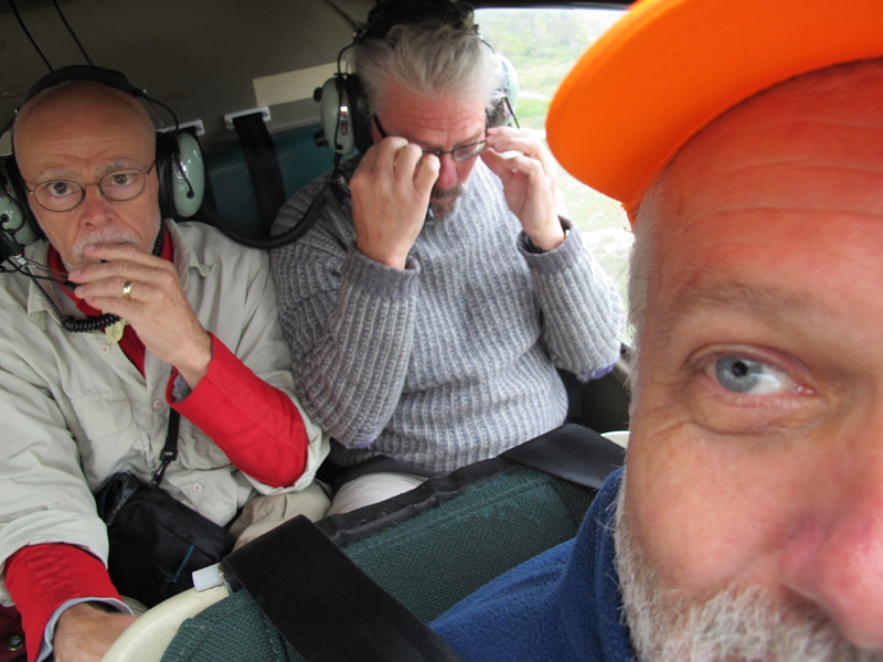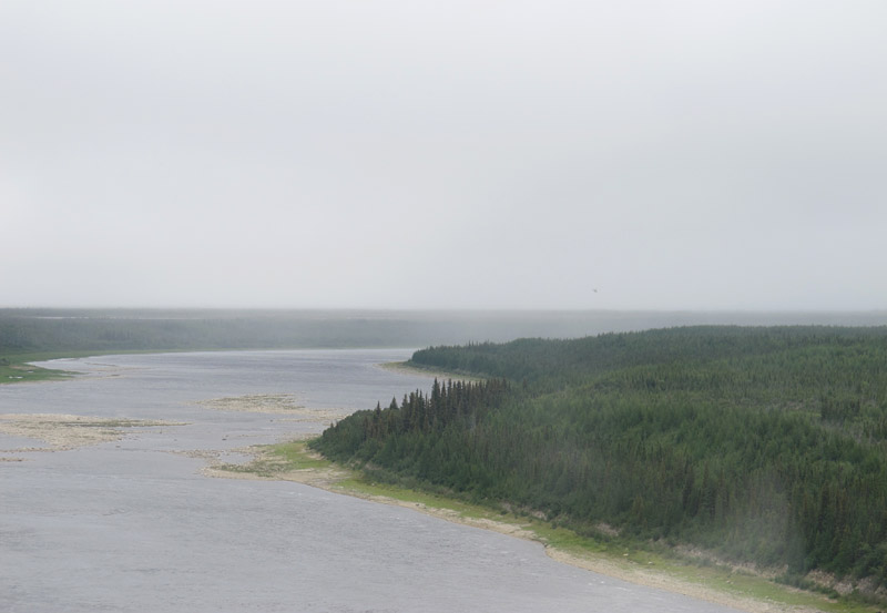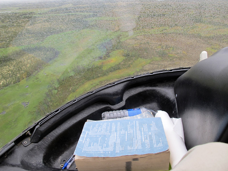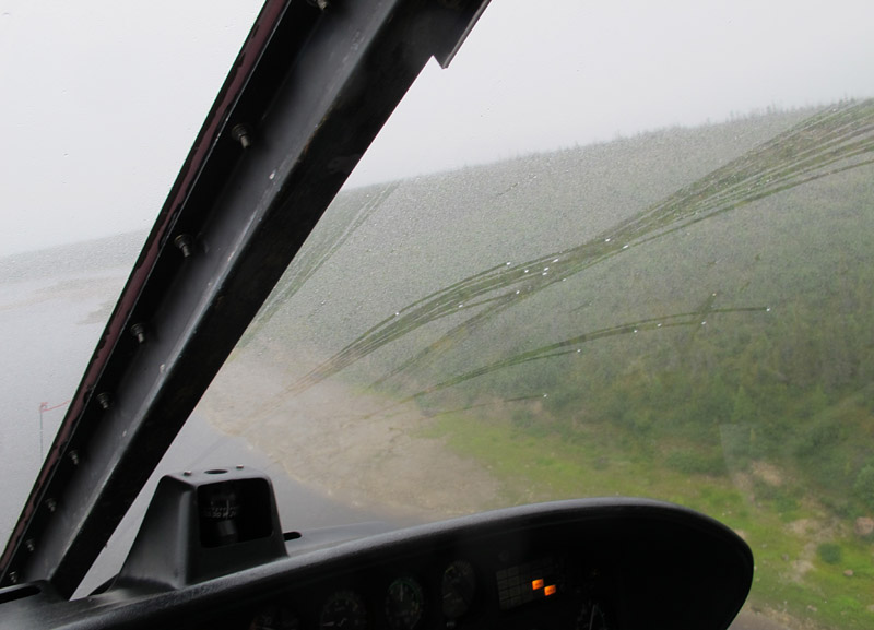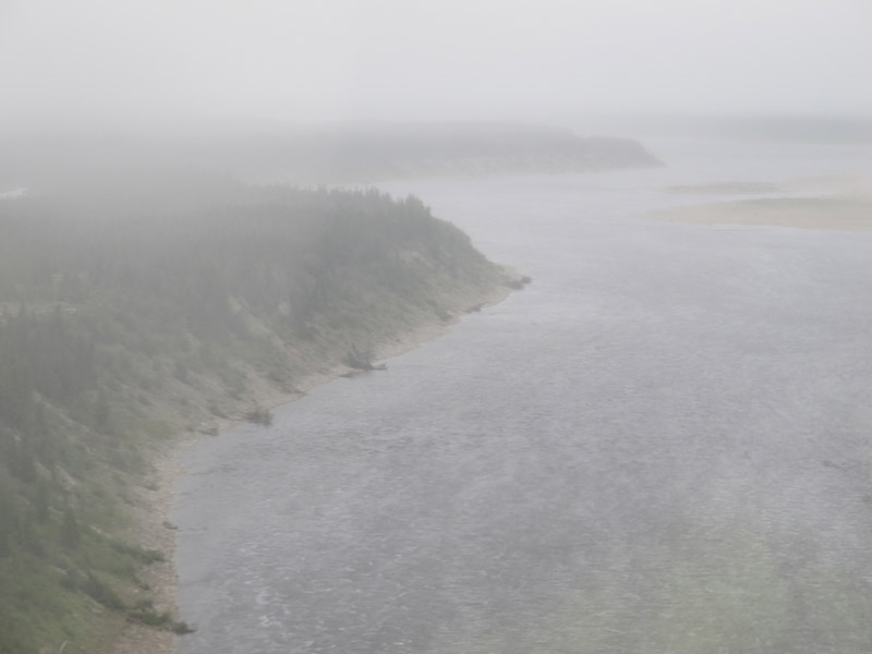 The helicopter pilots, both with decades of experience, seemed quite cheerful and ready to go, so who were we to argue?  So we buckled in and set off for our sites, some tens of kilometres inland on the bank of the Churchill River. As shown in the photos below, the conditions we met en route were sometimes almost artistically misty, but always acceptable for flight. And as we arrived at the first site the fog and rain began to depart, revealing a day that became, by lunchtime, quite splendid for fieldwork.
