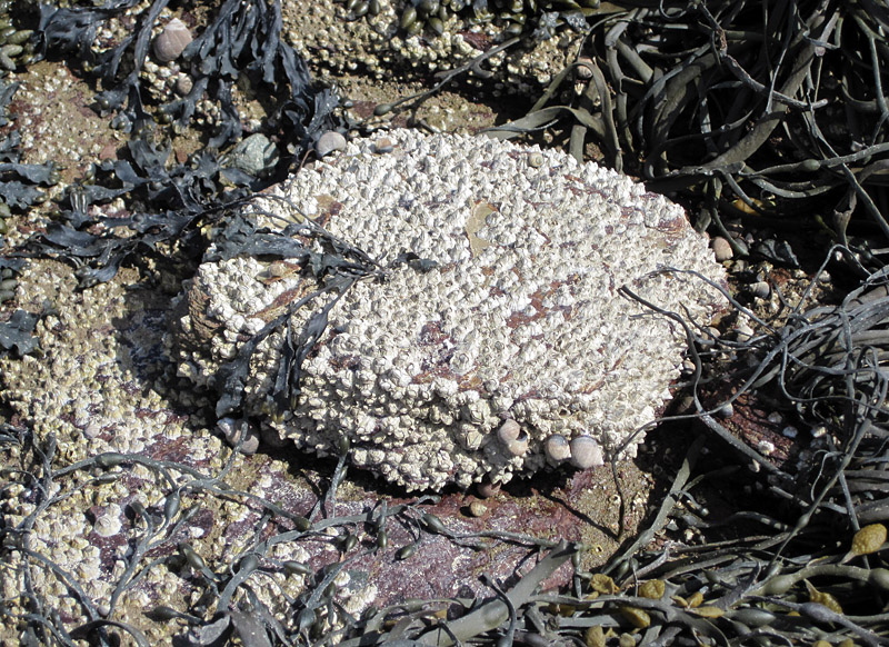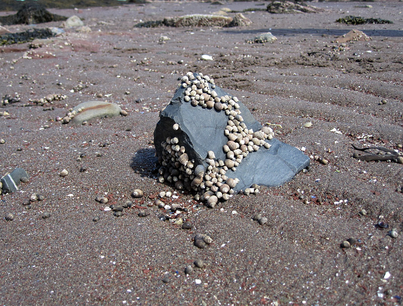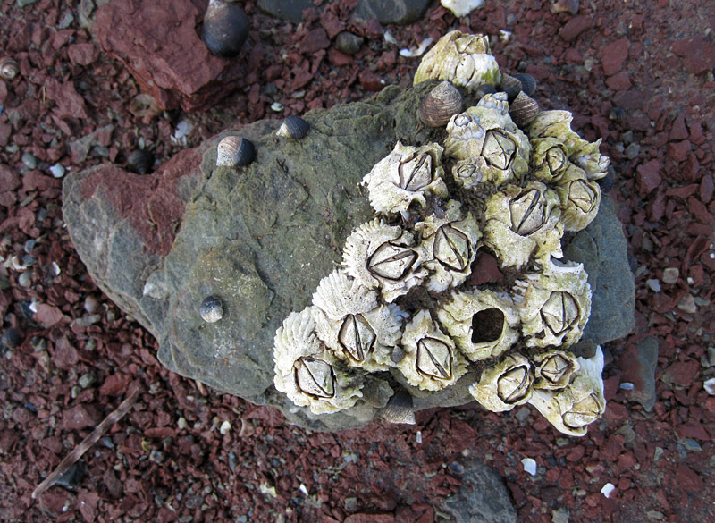 Saturday had the only pleasant afternoon in a string of wet days. Wandering around on the seashore at Saint Andrews, N.B., I began noticing all the creatures and seaweeds attached to solid rock. In some large areas they were fixed to the bedrock, Upper Devonian sandstone belonging to the Perry Formation; these were easy to observe, the fields of dark seaweed interspersed with patches of white barnacles. Between these, the modern sands of the tidal flat were home to almost no attached life, but many of the stones that were cobble-sized or larger were heavily encrusted. In addition to the attached encrusters, some stones hosted numerous periwinkles; these gastropods often prefer hard surfaces.