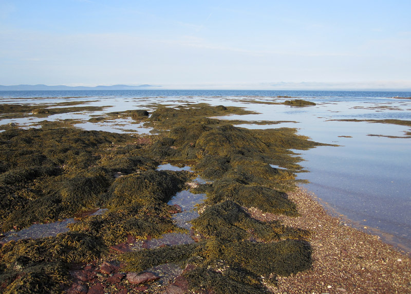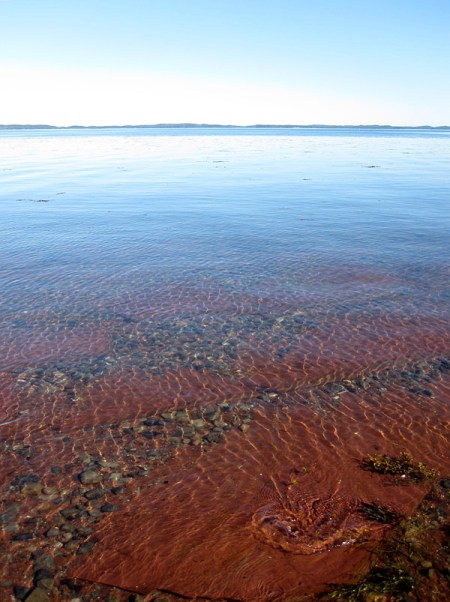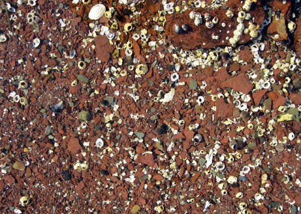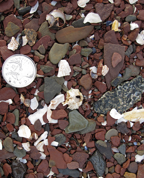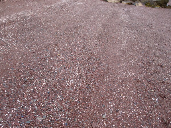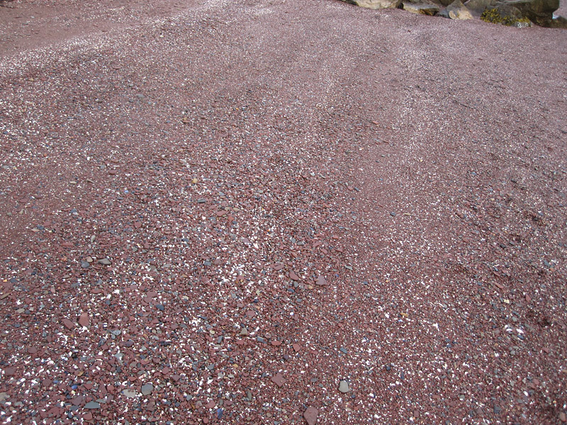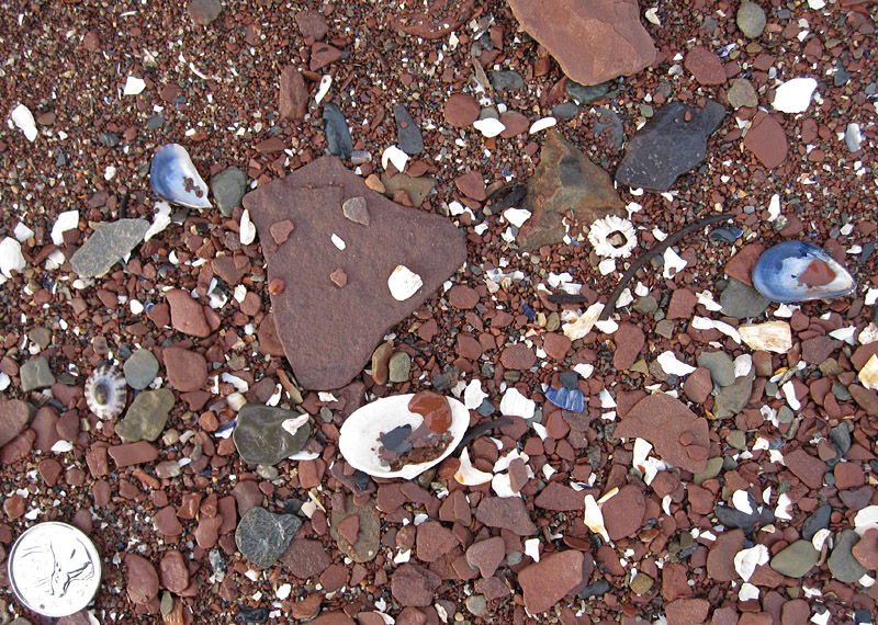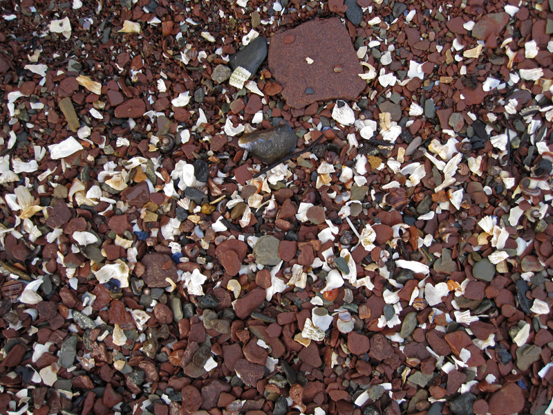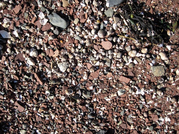 Looking between your feet, you notice a few shells: clams, mussels, barnacles, periwinkles, the occasional crab carapace. They show white, brown, and blue against the gravel that forms this beach. The gravel is red, a beautiful deep ochre flecked with grey, black, and white. The red comes from pieces of the same old sandstone that forms the bones of this point. The grey and black are clasts of other rock: basalt, schist, and granite.