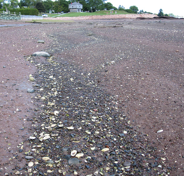 There must be hundreds of shell fragments, possibly thousands, in that two-metre-square in front of you. Why are there so many bits of shell here, when there are only a few complete shells in the same area? The answer lies in that red gravel. To break up so much sandstone bedrock into little bits of gravel requires the application of considerable force over a substantial interval of time. That force was supplied by waves and currents, driven by wind and that twice-daily tide, day in and day out over seasons, years, and centuries.