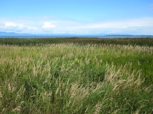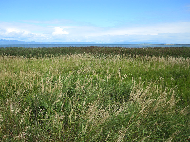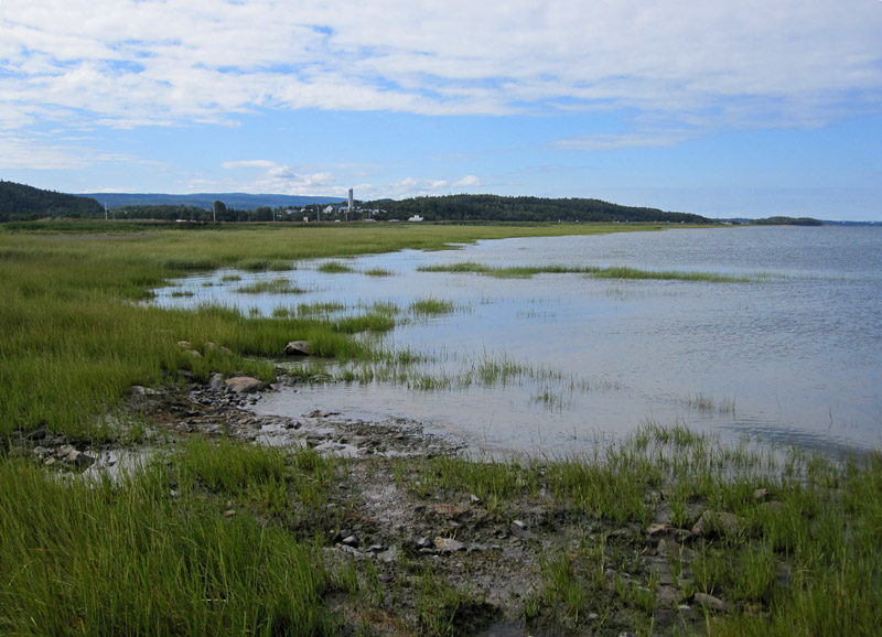 La Pocatière is a most appropriate place for this: the broad St. Lawrence estuary is narrowing here and becoming fresher, in comparison with downstream shores around Cacouna or Trois-Pistoles. Still, the salinity is at about 15 parts per thousand, almost as salty as some parts of Hudson Bay and far more salty than the Baltic Sea, so we can definitely say we are still “by the sea.” Also, the shore here is characterized by a Spartina (cordgrass) dominated marsh, and it is lovely.